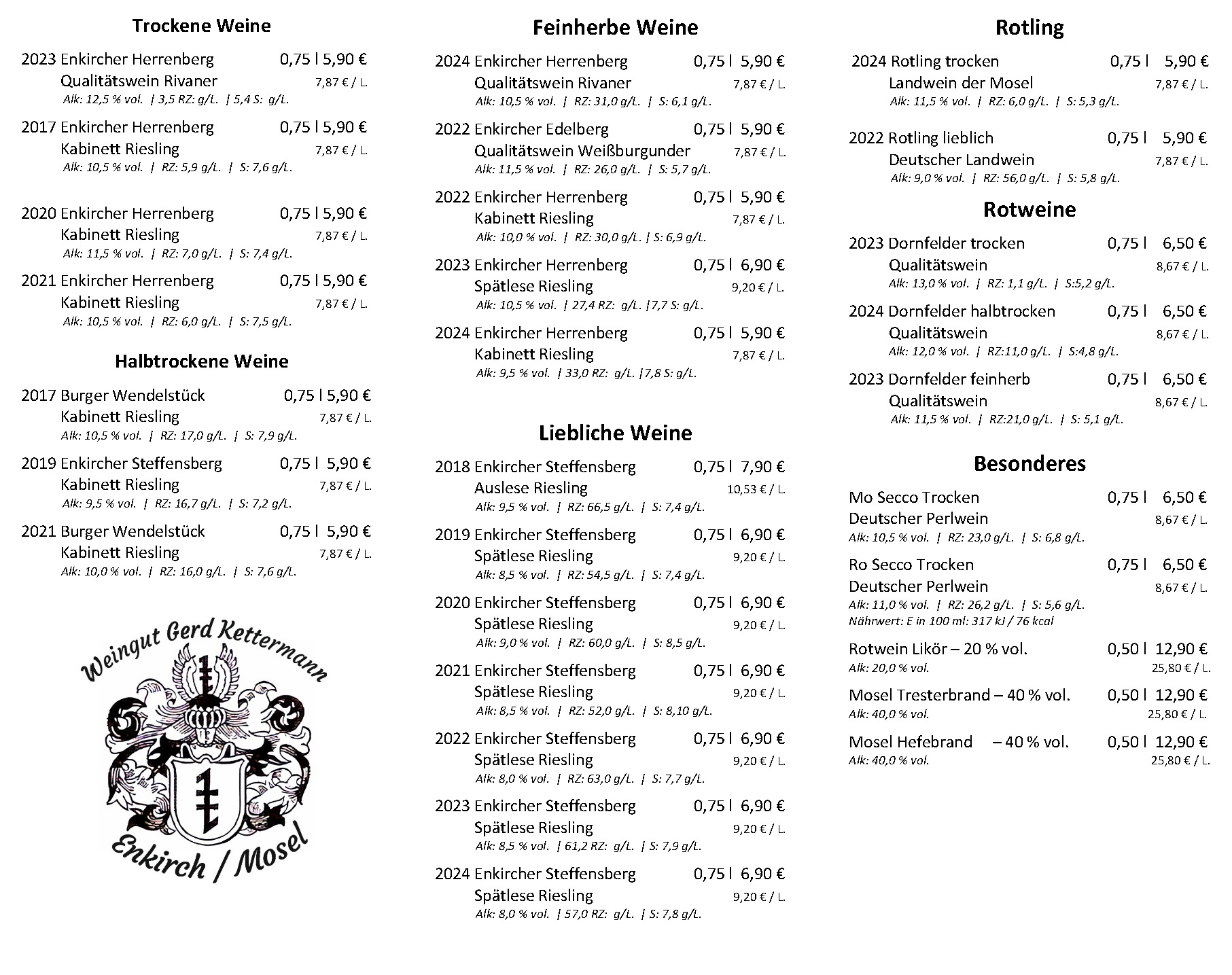Hinweis: Alle Weine sind deutsche Weine aus eigenem Anbau, enthalten Sulfite und sind allergenfrei.